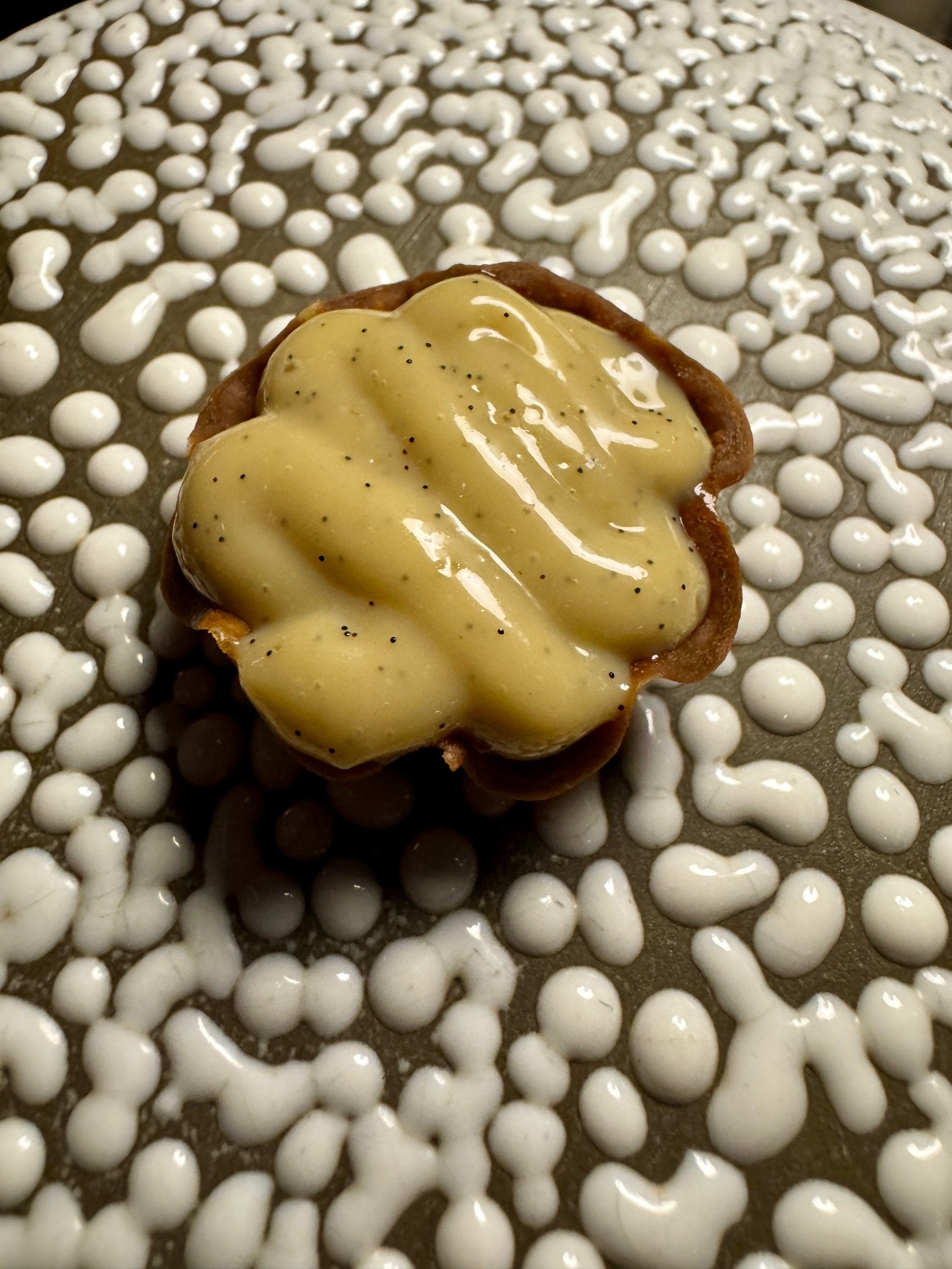 Custard Factory Tart; Ithaka spent coffee custard, passionfruit, crispy milk
