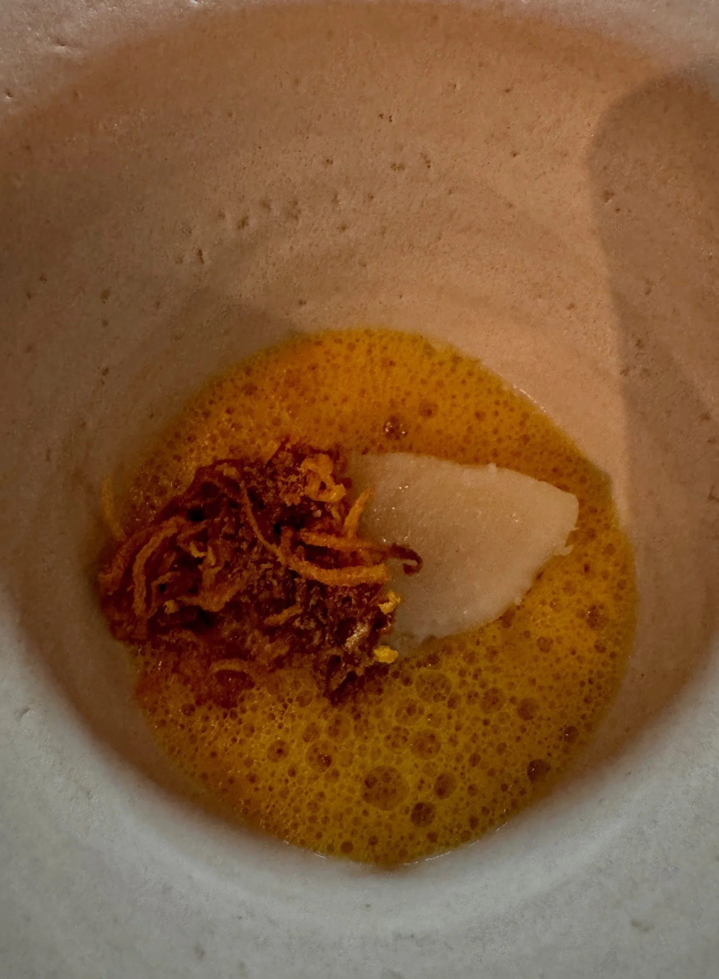 Orkney scallop is served with spiced pumpkin 3 ways, crusty rosti, puree and foam with roe kimchi offering an umami-tempered kick heightened with fragrant kaffir lime. We’re also brought a bonus ‘under development’ dish of miso custard, pickled maitake, caviar, and fresh truffle that pushes all the savoury pleasure buttons.