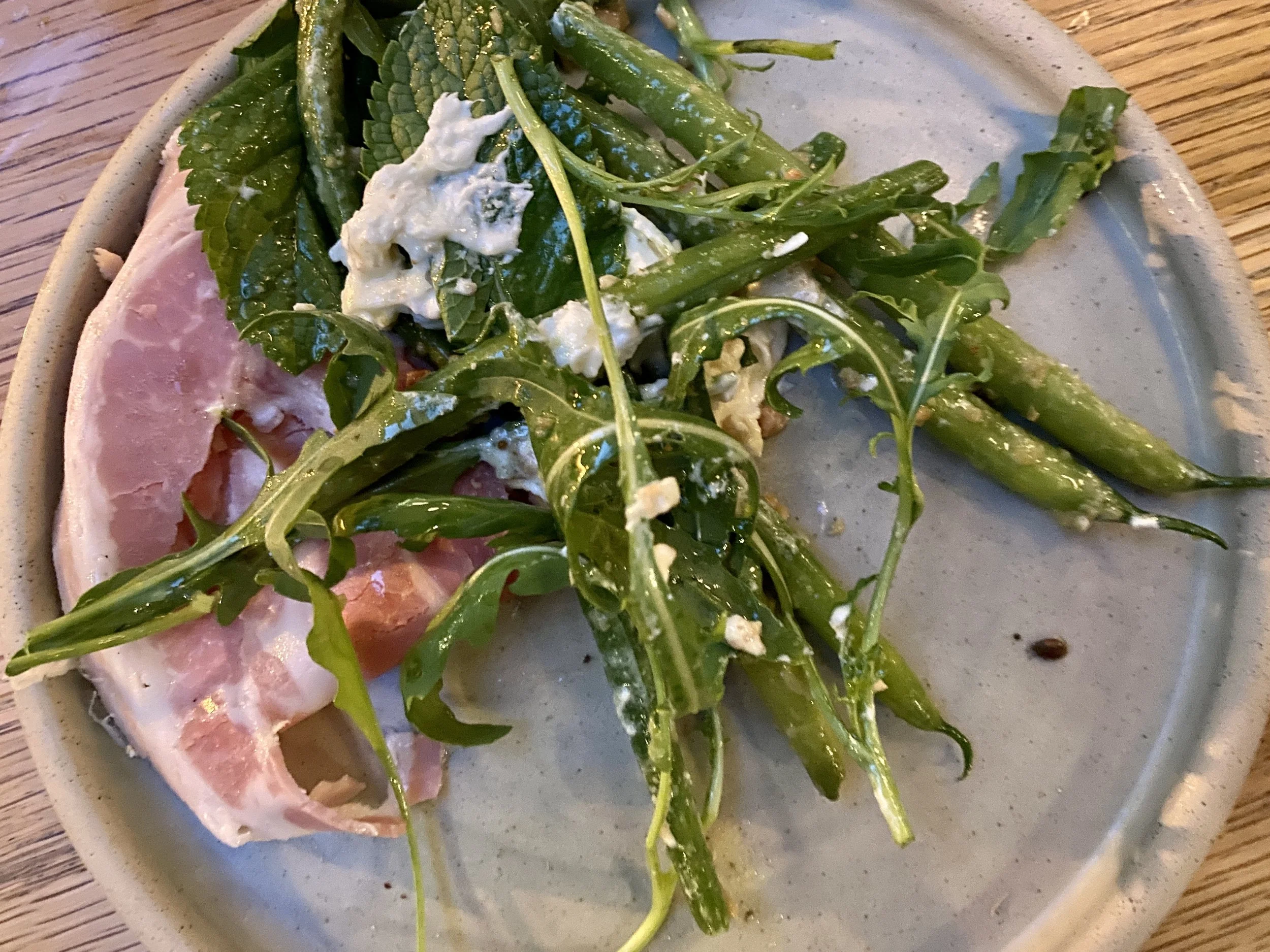 Summer salad of fine beans, leaves, fior di latte, figs, pancetta cotta