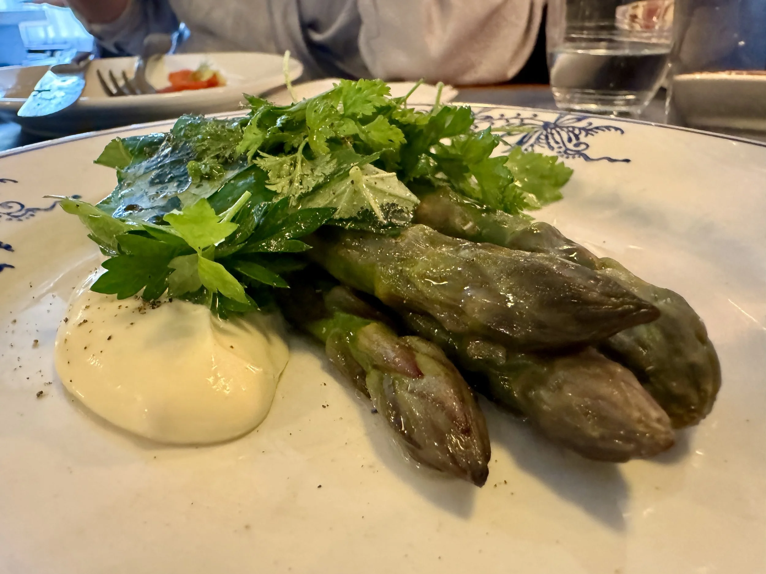 Four Spring-grassy flavoured, perfect on the bite, king asparagus spears are served with a walnut-whipped cream, with a sprinkling of verdant, fresh herbs, although they’re mostly cast aside as we go in with bread for that walnut cream.
