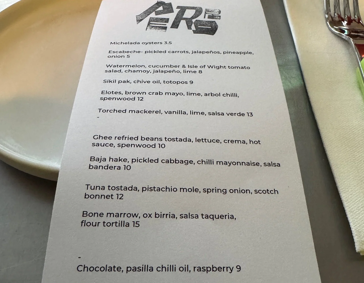 On evenings, there’s a seasonal weekly / daily changing menu, featuring five small plates, four taco / tostada / tortilla based ‘mains’ and just one dessert. It’s perfectly formed, but the absence of their caviar topped, burnt vanilla cheesecake sends a ripple of disappointment across the whole table.