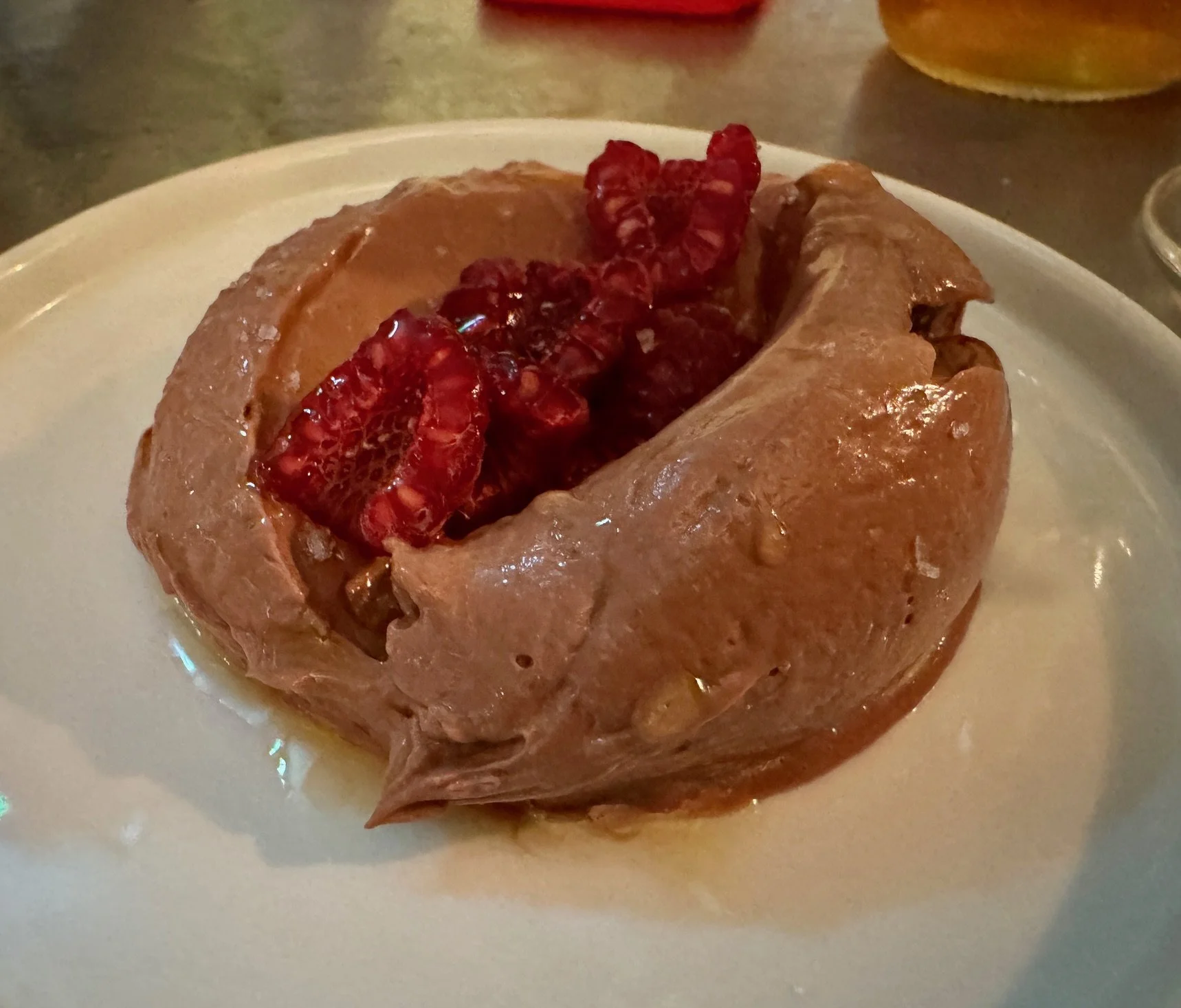 I then make the mistake of persuading the table to help out with my dessert (asking for four spoons). It’s a nailed on delight; being a silky, light chocolate crémeux, in a puddle of tangy pasilla chilli oil and with the light tartness of fresh raspberries. I probably don’t even get my quarter share and would order another, but I’ve eaten way too much food.