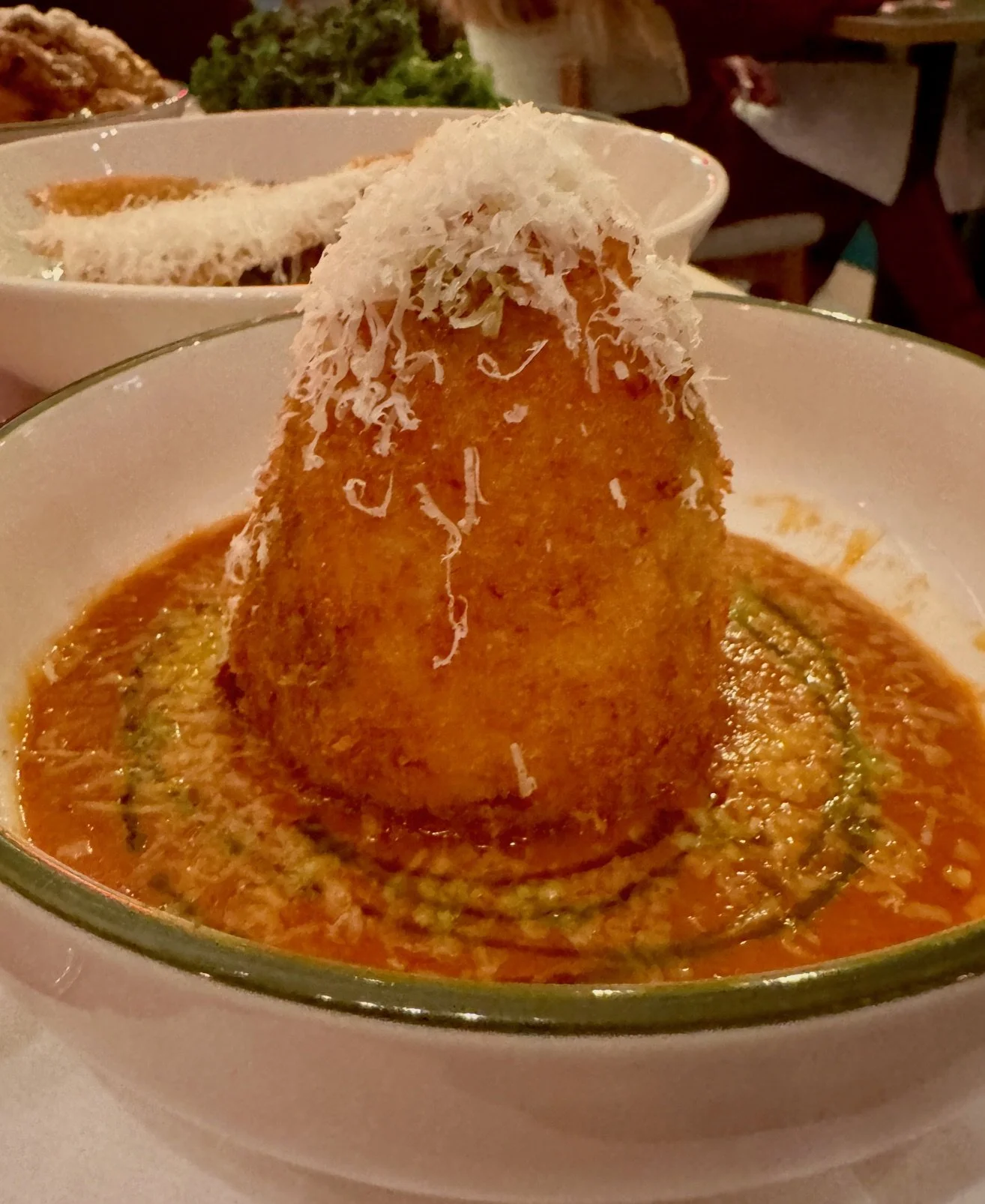 Barbecued, buttery baby potatoes in a sweet and tart caponata are superb, but a conical arancino filled with mozzarella is gummy and bland, although it’s probably not helped with us eating it last of the four dishes.